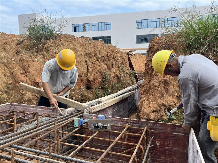 鹿寨智慧林業(yè)零碳循環(huán)產(chǎn)業(yè)園項(xiàng)目,管理人員正在進(jìn)行鋼筋套筒扭矩測(cè)試。