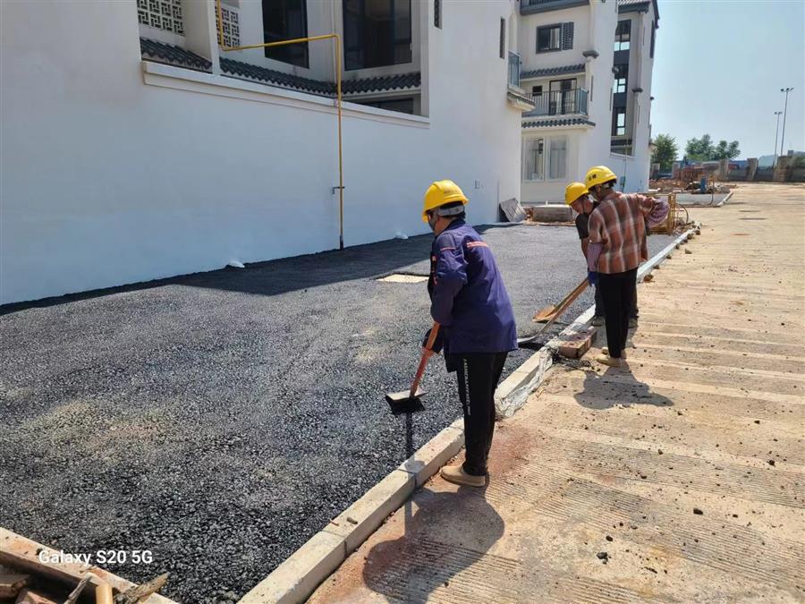 鹿寨縣城南新區(qū)城中村改造項(xiàng)目設(shè)計(jì)-采購-施工(EPC)總承包項(xiàng)目,工人正在對(duì)室外道路鋪設(shè)瀝青。