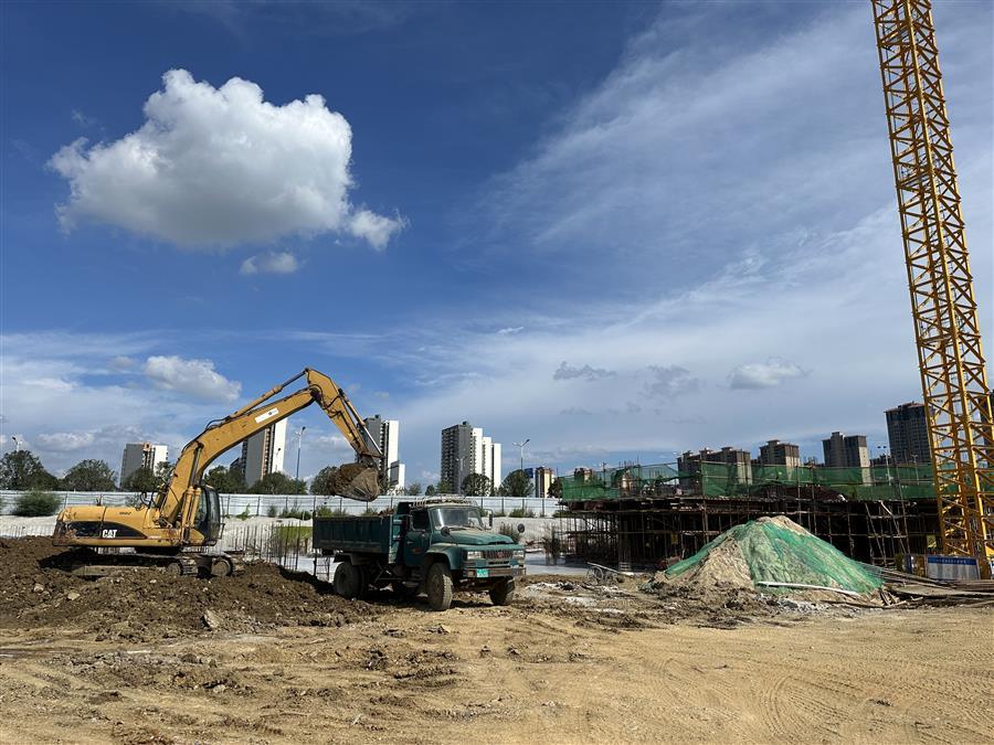 在農(nóng)投思賢幸福加項(xiàng)目,技術(shù)人員測(cè)繪、工人在綁扎鋼筋各作業(yè)面工作人員緊張忙碌地開展工作;施工機(jī)械運(yùn)轉(zhuǎn)不停、運(yùn)輸車輛來(lái)回穿梭,一派繁忙景象。
