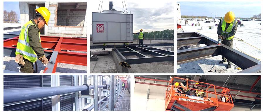 冷風(fēng)機(jī)設(shè)備入場(chǎng)后,項(xiàng)目部立即有序開(kāi)展焊接吊風(fēng)機(jī)平臺(tái)工作,完成平臺(tái)焊接后,項(xiàng)目部合理安排進(jìn)度計(jì)劃,實(shí)施進(jìn)度管理。經(jīng)過(guò)項(xiàng)目部全體人員的連續(xù)奮戰(zhàn),項(xiàng)目4號(hào)庫(kù)12臺(tái)冷風(fēng)機(jī)已順利安裝到位,管道安裝完成80%;1號(hào)庫(kù)完成4臺(tái)蒸發(fā)式冷凝器安裝工作,下一步進(jìn)行管道安裝。