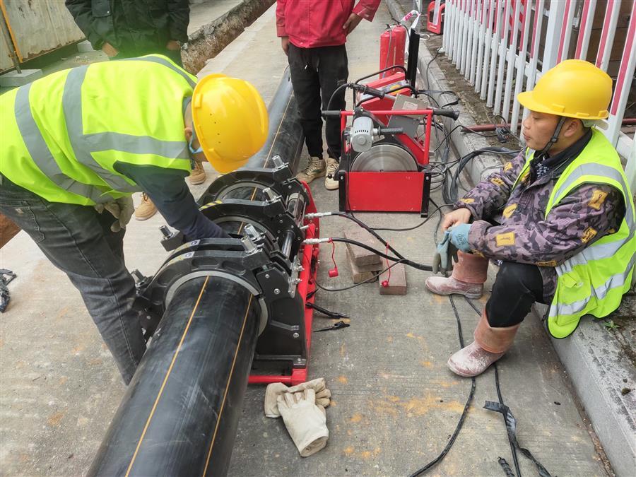 施工人員在航銀路進(jìn)行焊管作業(yè)