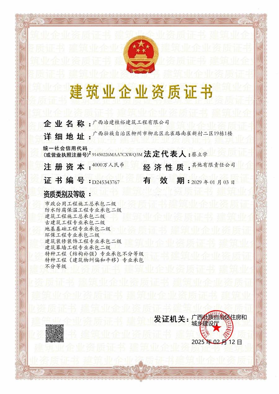 這8項(xiàng)專業(yè)承包資質(zhì)分別是:防水防腐保溫工程、古建筑工程、地基基礎(chǔ)工程、環(huán)保工程、建筑裝修裝飾工程、建筑幕墻工程、特種工程(結(jié)構(gòu)補(bǔ)強(qiáng))、特種工程(建筑物糾偏和平移)專業(yè)承包資質(zhì)。此批資質(zhì)將為桂裕公司后續(xù)的業(yè)務(wù)承攬、拓展區(qū)域市場提供有力保障,為冶建公司高質(zhì)量發(fā)展添磚加瓦。